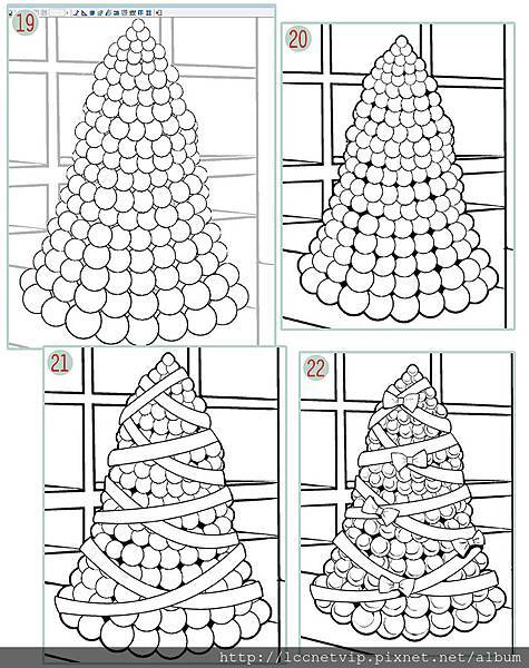 ◎接著把吸引住主角目光的目標:華麗的大蛋糕和馬卡龍塔畫出來,放在商店櫥窗的位置。