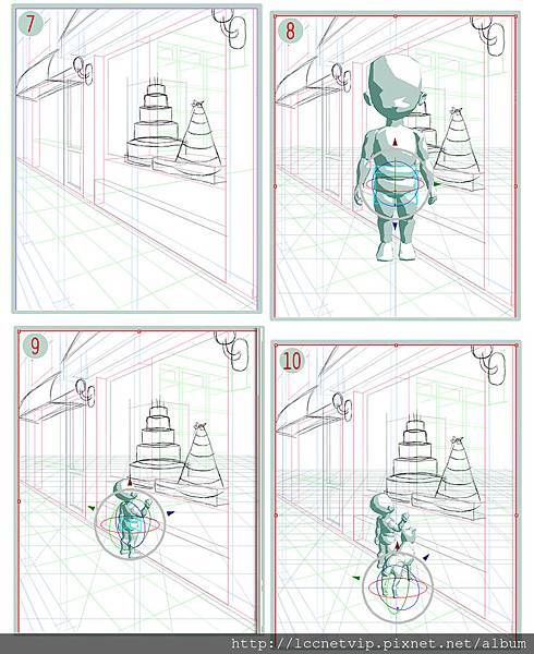 ◎匯入3D的三頭身人偶和小狗,調整透視點和視角。