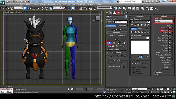 創建Biped,尺寸大小大約和馬一樣高就行了。點下Figure Mode, Body Type選擇Female比較容易看明白脊椎對應身體的合適位置。建議Spine Links的數量3或4。