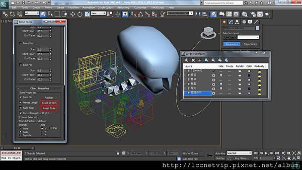 韁繩的部分需要與其他角色互動,就不傾向用Biped的Xtras來做了。另外用Bones做FK、SplineIK或伸縮骨架都很適合。對稱製作Bones的方式,一般是不推薦直接鏡射,那雖然對蒙皮沒甚麼影響,但會造成Link的子物件法向量相反。比較建議的方式是選擇要對稱製作的Bones使用Bone Tools裡的Mirror,如果先前調整位置時有使用到縮放,先使用Reset Stretch和Reset Scale來修正尺寸定義再點Mirror。