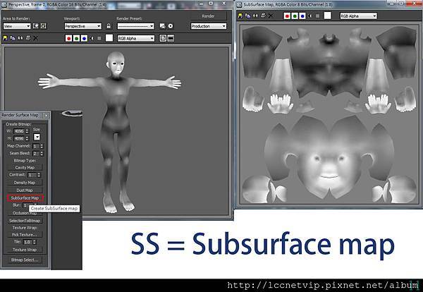 使用3DS MAX的Render Surface Map,可以產生Subsurface Map幫助你找出厚薄的差異。對於不透明的物件也能使用,用來表現物件的銳利度。越薄的結構越銳利,高光也就越強烈。程式自動產生的貼圖,是無法十全十美滿足每個人的需求的,必須依各人需要做點修改。