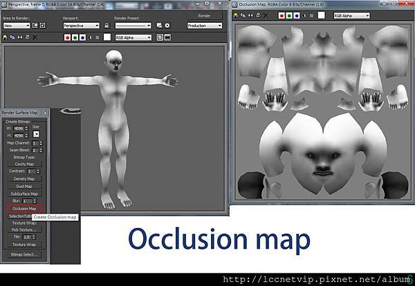 使用3DS MAX的Render Surface Map,可以產生Occlusion Map幫助你找出陰影遮蔽的位置。也可以再加上Mental ray的Ambient Occlusion Map來增加陰影遮蔽的細緻度.。必須留意的是Ambient Occlusion Map是連同週遭環境一起做計算產生的貼圖,除了受到場景裡其他物件影響之外,還受到光源方向影響,使用時須斟酌。