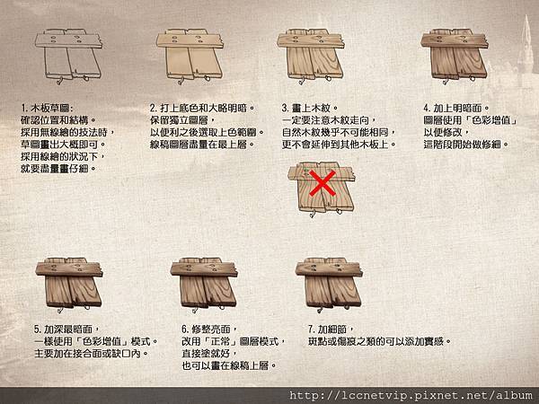 角色設定美術比較少碰到木材質,多半是場景設定美術會碰到,但設定可以畫的簡單粗略,然後貼張照片標示,說實際得畫這樣,最後還是負責貼圖的美術要完善它,而這類美術通常是新人或者資歷較淺的美術。所以,還是要多練練。