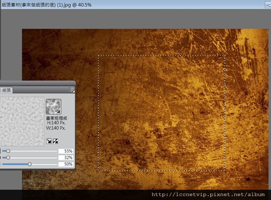 8.隨意去Google搜尋紙張紋路,選出一張合適的紙紋以後,到Painter內打開,再使用左邊的 ”矩形選取區” 選擇紙張隨便一個範圍,圖示中的虛線方框就是選取後的樣子。