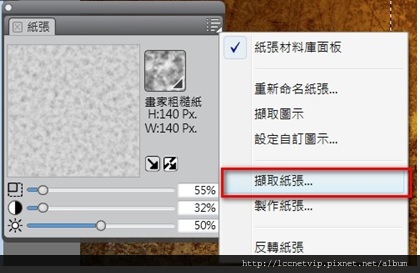7.接下來,就要來玩紙張紋路了。先到上頭的工具列的 "視窗>紙張面板>紙張"如圖將紙張面板打開。
