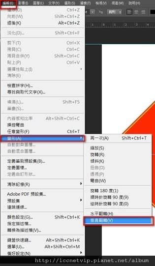 10.接著先選擇字體圖層,接著跟著圖示做, 編輯>變形>垂直翻轉 的動作,讓字體倒過來。