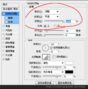 14.接著調整圖層樣式的「斜角和浮雕」,如圖調整>樣式(浮雕)、技術(平滑)、深度(1000%)、尺寸18像素。