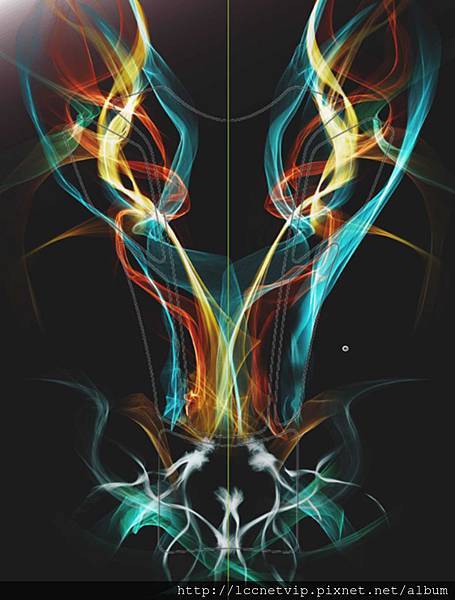 2.把刀模圖層的透明度調低,以看得到為原則。打開對稱功能後運用微粒/春綢緞帶及微粒/彈簧火球筆刷先把背景鋪陳出來,然後把筆觸過重的地方輕輕擦淡。