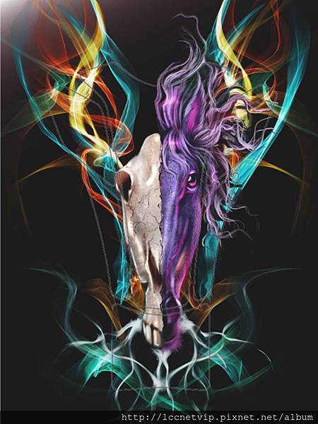 7.左邊馬骷顱頭則在頭頂、眼窩、鼻腔處加上詭異的烈火!確定完成後將所有圖層合併(刀模圖層除外).....................!