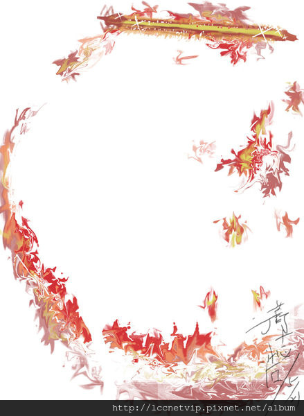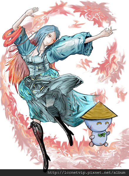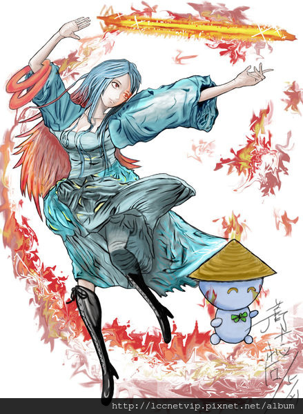 火焰的大特效:我從以前常玩的『神奇寶貝』裡記得的那隻神鳥『鳳凰』一招『大字焚火』,沒錯,只有5次的那招。概念從那邊出來的,因為想大約營造出那種氣氛。而上面那把細細的,是她的魔法武器(應該像劍吧),火靈劍的樣子射向目標(雖然我沒畫目標)。