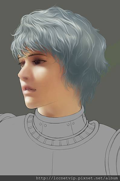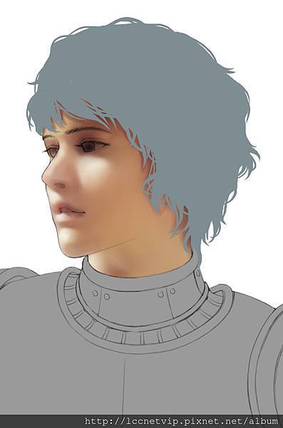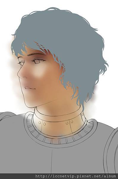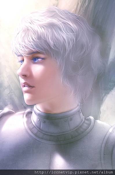 而這種能從軍的女漢子,勢必長像會有點男性化,所以我就畫了個美男子,並穿著西方盔甲,就說是聖女貞德,髮型上我也沒考究,就畫了個短髮,但應該要畫當時的法國農村少女的髮型,不過她也有可能從軍後剪了個短髮,或七分頭也說不定,不過從聖女貞德電影版的女主角造型看來,是個短髮且像男生的女演員來飾演,就是演惡靈古堡的蜜拉喬什麼的,她也演過第五元素,不過我個人認為她長相挺像男生的,好的話不多說(其實說很多了) ,來看看完成後的樣子。