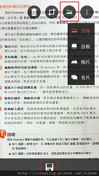 拍攝完後,可以針對你所拍攝的類型做修正,如掃描器的按鈕處,提供了相片、白板、名片,白板的部分,當會議上你所拍攝的白板照,可以快速的製作會議簡報,這邊因為鳥編是拍攝書籍,所以以文件處理即可。