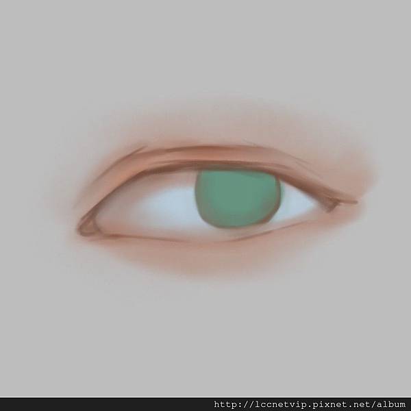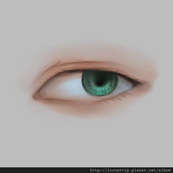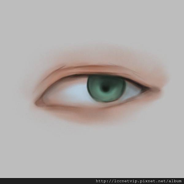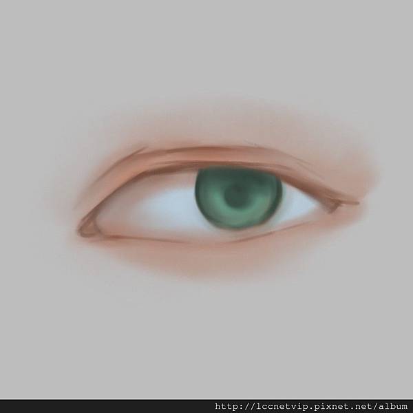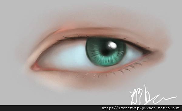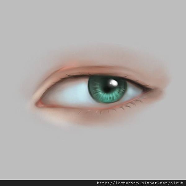 9.將靠近眼睛上下的皮膚點亮並且畫上瞳孔最亮的白色後就完成了!其實眼睛只要理解他的立體改念以及構造和上色方式,就很容易畫了^^。