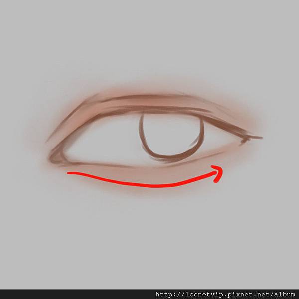 2.接著使用一些暗膚色,先畫出眼睛周圍的皮膚,而眼睛下方紅線標註的部分為「臥蠶」,必須畫出臥蠶的部分眼睛才會有神唷!千萬別畫得像黑眼圈。