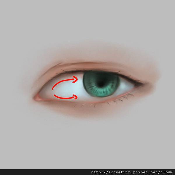 8.這邊畫上眼睛「眼肉」的部分,眼肉的部分可以使用較亮的紅色以及點上高光,看起來才會更加寫實,將眼白的部分也畫上更白的顏色,而這邊要注意眼球的立體概念,紅色標註的部分為眼球球體的立體概念。
