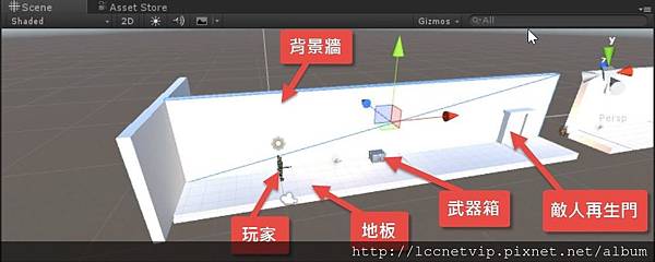 要建立場景可使用GameObject→3D Object→Cube,縮放方塊擺放適當位置,建立簡易場景,也可以在3dsMax等繪圖軟體繪製場景,再匯入Unity。可以在Window底下的AssetStore下載遊戲素材,準備好一個人物玩家與武器箱,之後玩家吃到武器箱,可以轉變武器類型。