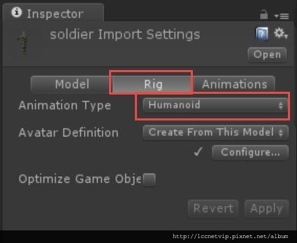 在Project專案視窗中,選到人物模型,Rig→Animation Type選Humanoid模式。