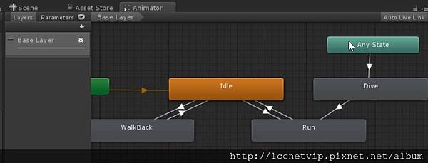 在Asset Store下載Animation動作片段,在Window→Animator視窗,設計動作的切換,如下圖,預設是Idle待機狀態,待機時,可以往前跑(Run),或往後跑(WalkBack),在任何狀態下(Any State)可以跳躍(Drive),跳躍結束時,回到跑步動作(Run)。