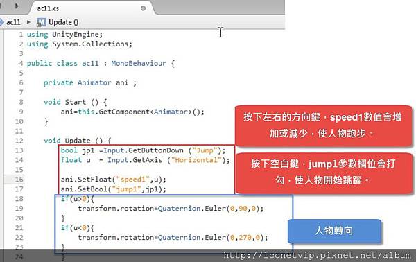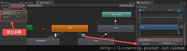 由Idle待機到Run跑步的動作,條件可設定為Speed1大於0.1,按下往前的方向鍵,speed1數值會增加超過0.1,人物就會切換至跑步動作。