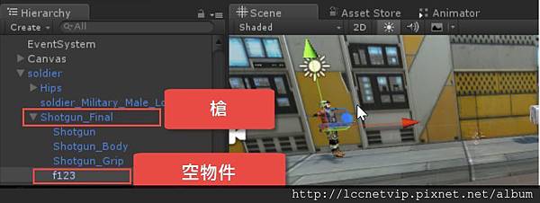 GameObject→Create Empty建立空物件,放置在士兵的槍的子物件,當作子彈發射器。