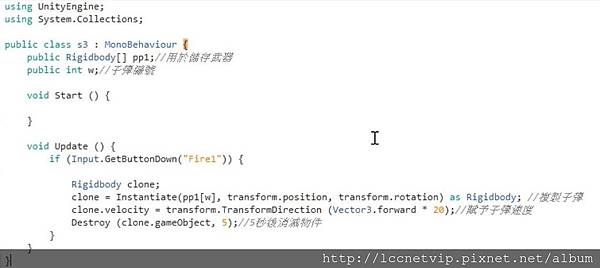 給予空物件複製子彈的語法。當按下Fire按鈕(滑鼠左鍵或Ctrl鍵),就會複製出子彈。