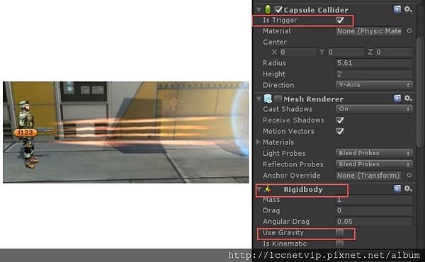 可下載特效的素材來當作子彈,且Collider元件的isTrigger欄位打勾,用於攻擊敵人時觸發語法。再加上Rigidbody元件,Use Gravity取消勾選,使子彈不受重力影響。