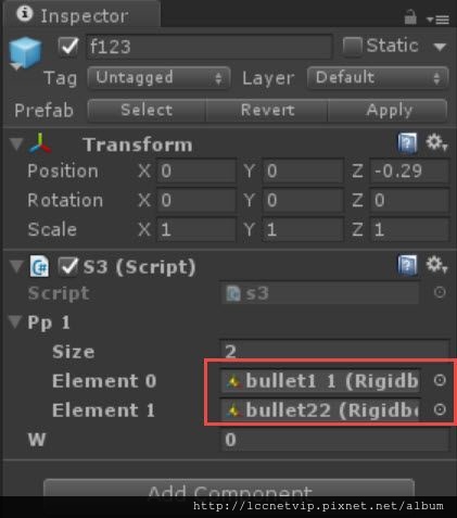 準備完成子彈後,就可將子彈拖曳至子彈發射器的語法欄位。Size輸入2,可產生兩個子彈欄位。