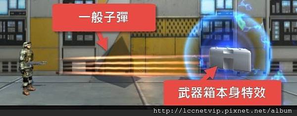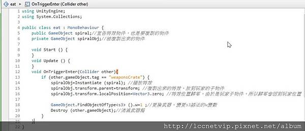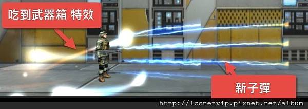 將轉換武器的語法給予人物,使人物吃到武器箱,會轉為第二種武器。此語法另外加上語法特效,吃到武器箱後,會產生特效,將需要產生的特效拖曳到spiral欄位即可。