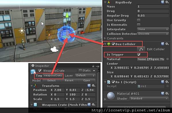 最後,將武器箱的tag變更為weaponsCrate,加入Box Collider元件並將isTrigger欄位打勾,使武器箱可以觸發事件。再加上Rigidbody元件且Use Gravity取消勾選,使不受重力影響,不會往下掉。