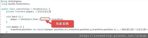 遊玩時,相機必須跟隨玩家移動,建立相機跟隨語法,並將語法給予相機。