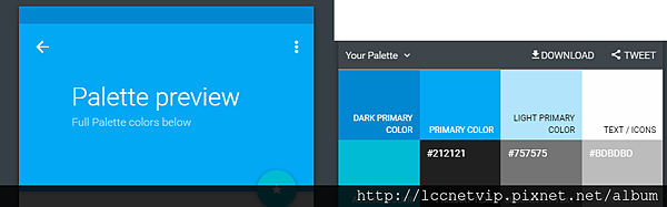如同網站名稱,為一款針對Material Design的配色工具,只需要點選出兩種顏色,就可立即呈現出預覽效果,並且提供給你額外適合的代碼,讓你可以快速使用。