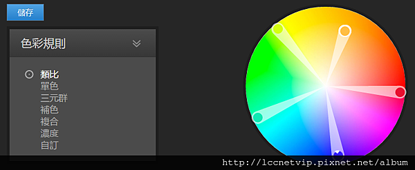 自Adobe color 在建立主題時,也是相當好用,可直接使用「類比」、「單色」、「三色群」、「複合」、「濃度」、「自訂」模式來建立,很直覺化,對於沒idea的人,馬上就可製作出具有特色的組合色來。