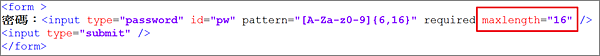 也可使用「maxlength」來限制輸入的最大長度 ,如超過16位元,就不會再顯示。