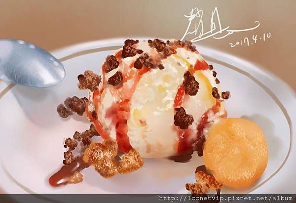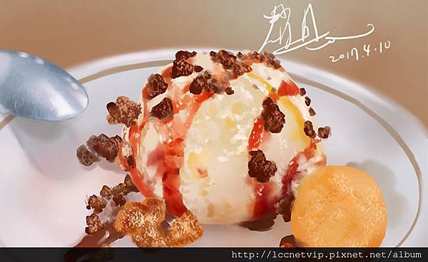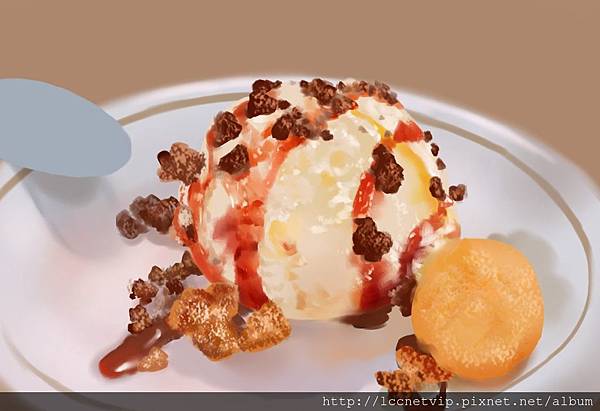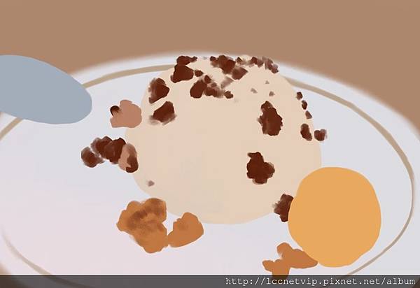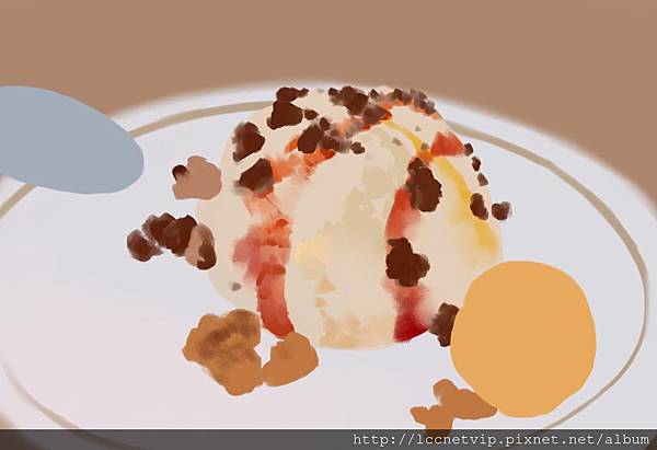 2.再來就是照舊的將所有物體的固有色畫上,這邊為了增加畫面的豐富度,所以我畫上了盤子、冰淇淋、冰淇淋上的巧克力塊、以及放在旁邊的湯匙;而冰淇淋顏色先別畫到最白,等立體概念都完成後再來用”點”的方式將反光畫上。