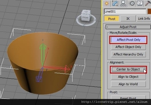 4. 使用【Affect Pivot Only】開啟軸心控制,點擊【Center to Objext】將軸心移動到物體中心,然後離開軸心控制。