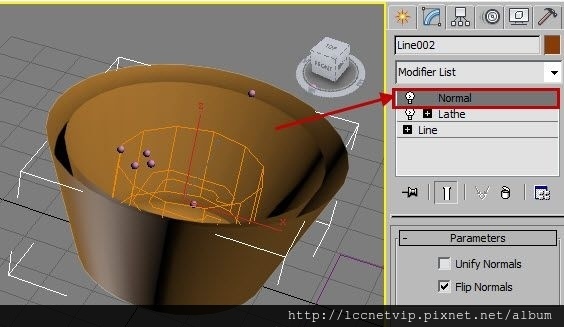 17. 選取內側的杯子,加入【Normal】修改器,來變更杯子為正面,使粒子可以反彈。