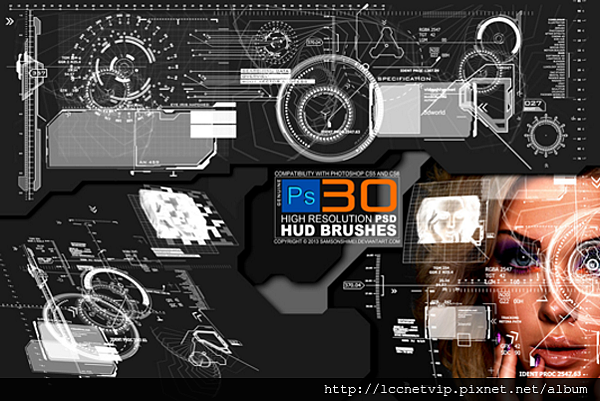 這套具有30款高解析度的筆刷,提供像鋼鐵人風格的所有HUD元素,包含爆炸圖和地形效果圖…等。但此款不能商業用喔!