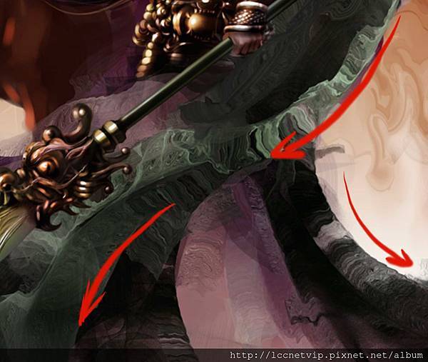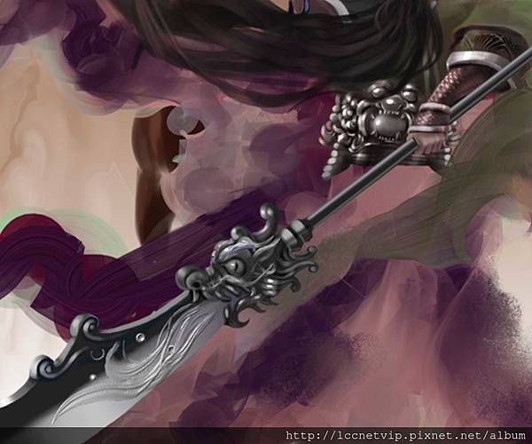 10.在「青龍偃月刀」上把造型和紋路精緻化,人物身上的護甲更不可忽略,這樣才能和抽象的服裝布料效果互相輝映,所為粗中帶細才能更有想像空間。