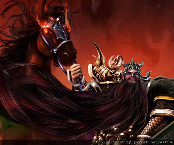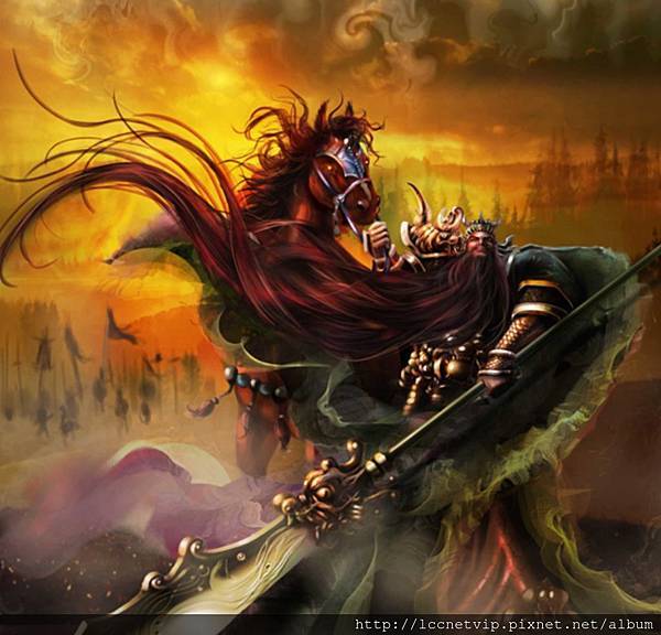 9.「青龍偃月刀」這時要當前蹬地一擺,一幅畫的整體感要先把氣勢營造出來,此外也幫赤兔馬穿戴上面假!
