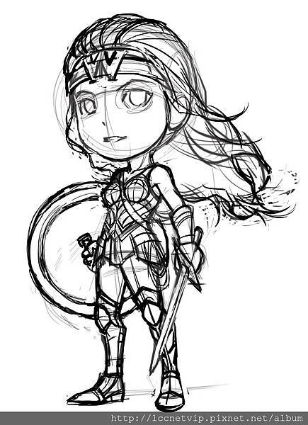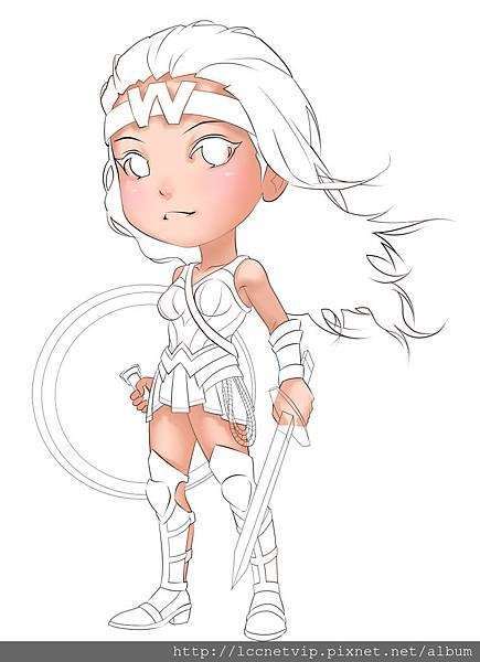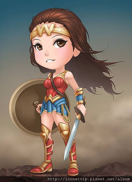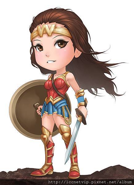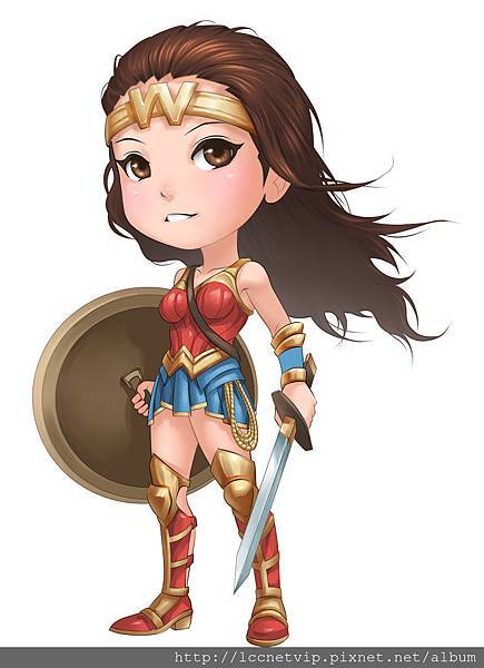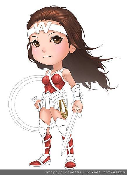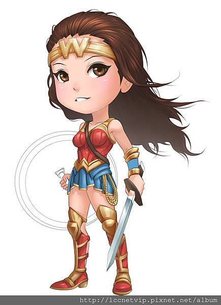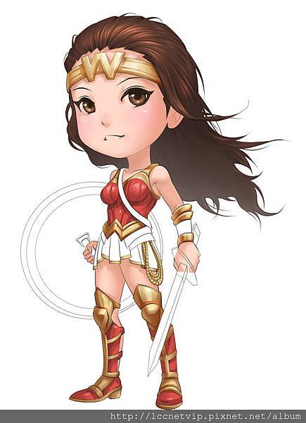 Q wondrewoman 是這次作畫的主題,就是Q版的神力女超人。所以在作畫前,我先上網找了不少她的資料。就是避免造型畫錯,而這種用現成造型來作畫是最方便的,因為不用思考造型設計。就省了很多時間,不過上網找圖也是需要點時間,同時也會看到許多有人畫神力女超人的圖。但是都沒看到有畫Q版,所以我就選擇畫Q版的神力女超人。那這次用到的筆刷有向量筆的塗鴉筆,混色筆的只加水,粉蠟筆的油畫粉蠟筆,噴槍的數位噴槍,就這些了。那就來看看完成後的樣子吧(如上圖)。