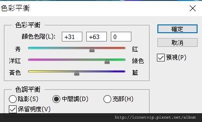 3.接著將整體的色彩調整為偏向綠色,調整方式為 影像>調整>色彩平衡。
